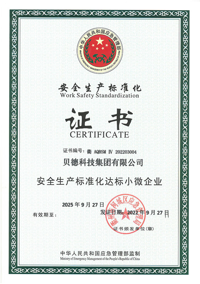 安全工作沒有最好,只有更好,貝德科技集團將以取得“安全生產標準化達標小微企業(yè)”證書為契機,不斷夯實安全生產管理,規(guī)范安全管理各項工作,提升安全生產水平,為公司長久發(fā)展保駕護航。