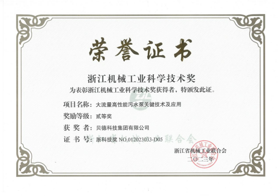 2023年12月,浙江省機械工業(yè)聯(lián)合會發(fā)布了《關(guān)于表彰2023年度浙江機械工業(yè)科學(xué)技術(shù)獎獎勵項目的決定》,表彰在機械工業(yè)科技工作中作出突出貢獻(xiàn)的單位和人員,共112個項目獲獎,其中一等獎14項、二等獎28項、三等獎70項,貝德科技集團有限公司憑借“大流量高性能污水泵關(guān)鍵技術(shù)及應(yīng)用”項目榮獲二等獎!