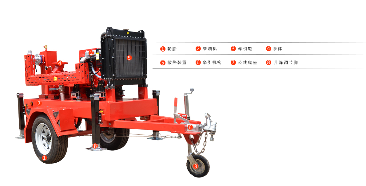 1.單級(jí)式移動(dòng)泵車(chē)主要由真空輔助裝置、柴油機(jī)動(dòng)力包、柴油機(jī)專(zhuān)用油箱、泵傳動(dòng)系統(tǒng)、設(shè)備底座、自吸泵總成、防雨設(shè)施、起動(dòng)裝置、起動(dòng)電源裝置、進(jìn)水管總成、出水管總成、二輪移動(dòng)拖車(chē)系統(tǒng)、快速起吊裝置等組成。